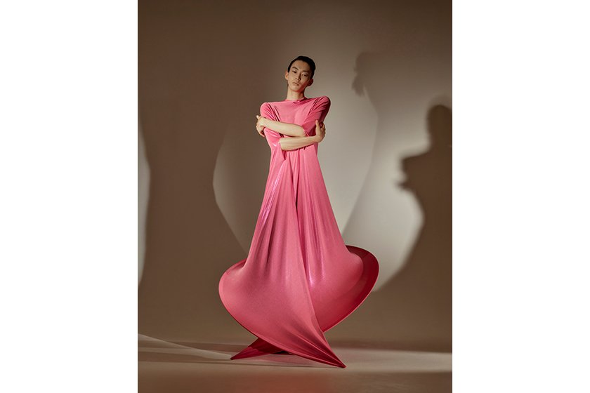 コレクションで発表しているドレスは、布というメディアを使ってはいるものの、完全に彫刻的なアプローチでつくっています。ボディに対して形を構築していくのですが、人間の関節を増やすような、新しい肢体を生み出しているような、そんな感覚です。ユーザー目線はまったくなく、体と造形の関係そのものに向き合っているんです。